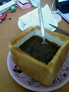 材料は食パン一斤程度とレトルトのシチュー。食パンの中をくりぬいて、湯煎したシチューを流し込み、オーブンにかければ出来上がりです。